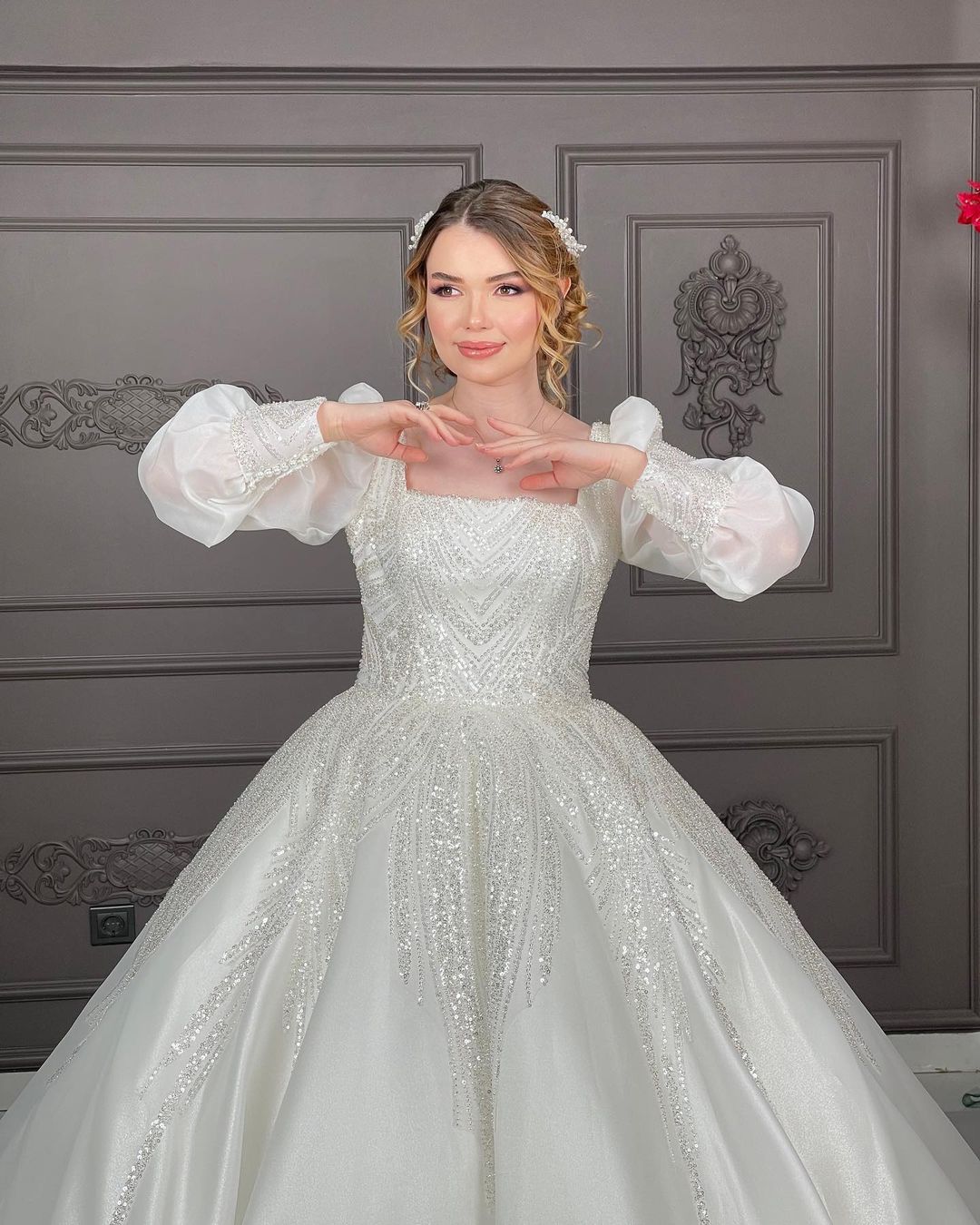 Arya Saten Prenses Gelinlik, sade ihtişamı zarif detaylarla buluşturan bir tasarım. Işıltılı işlemeleriyle süslenmiş saten kumaşı, asil bir duruş kazandırırken kare yakası ve balon kolları romantik bir görünüm yaratır. Hafif kabarık etek formu, gelinliğe klasik prenses silueti verir. Göz alıcı parlaklık ve sade zarafet bir arada sunulduğundan, Arya Gelinlik hem modern hem geleneksel konseptler için mükemmel bir seçimdir.