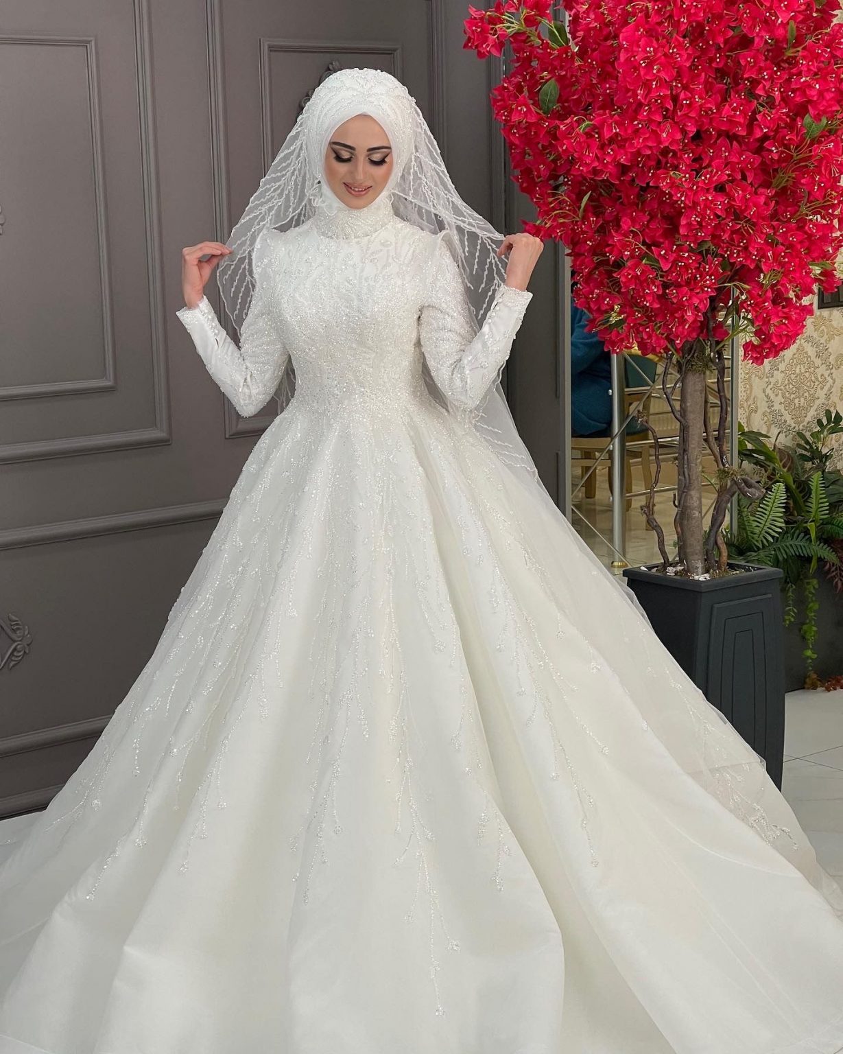 Elif Sim İşlemeli Tesettür Gelinlik, klasik asaleti modern bir zarafetle buluşturur. Yüksek yakası, zarif omuz formu ve tamamen sim işlemeli tül dokusu ile göz kamaştıran bir ihtişam sunar. Parlaklığıyla salon ışıklarında büyüleyici bir yansıma oluşturan bu model, sade ama etkili bir duruşu tercih eden gelinler için idealdir. Geniş etek formu, kusursuz bir prenses silueti oluşturur.