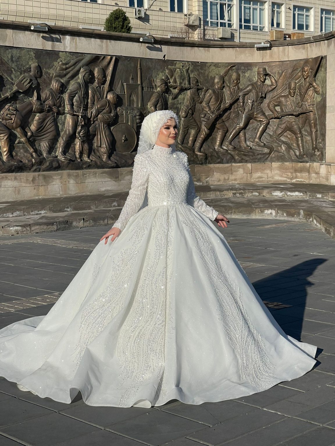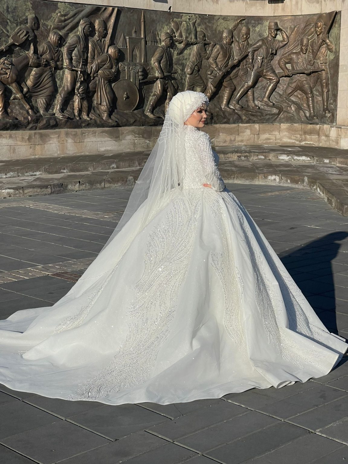 Esila Tesettür Prenses Gelinlik, zarafetle ihtişamı kusursuz bir şekilde birleştiriyor. Tam kapalı formu, yüksek yaka detayı ve inci taşlarla süslenmiş işlemeleriyle göz alıcı bir duruş sunar. Işığı her açıdan yansıtan simli tül kumaşı, açık hava çekimlerinde ve salon düğünlerinde büyüleyici bir etki yaratır. Omuz hattındaki zarif form ve akıcı etek yapısı, asil bir siluet oluşturur.