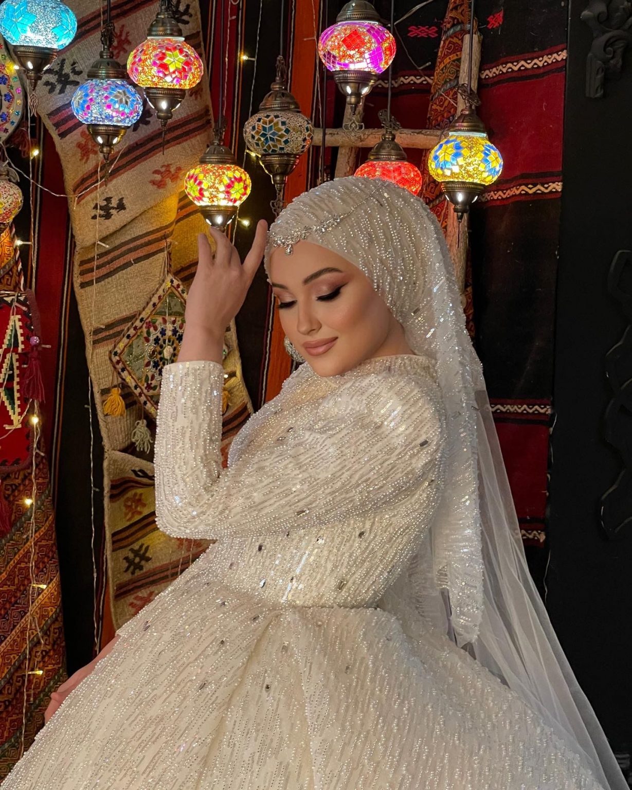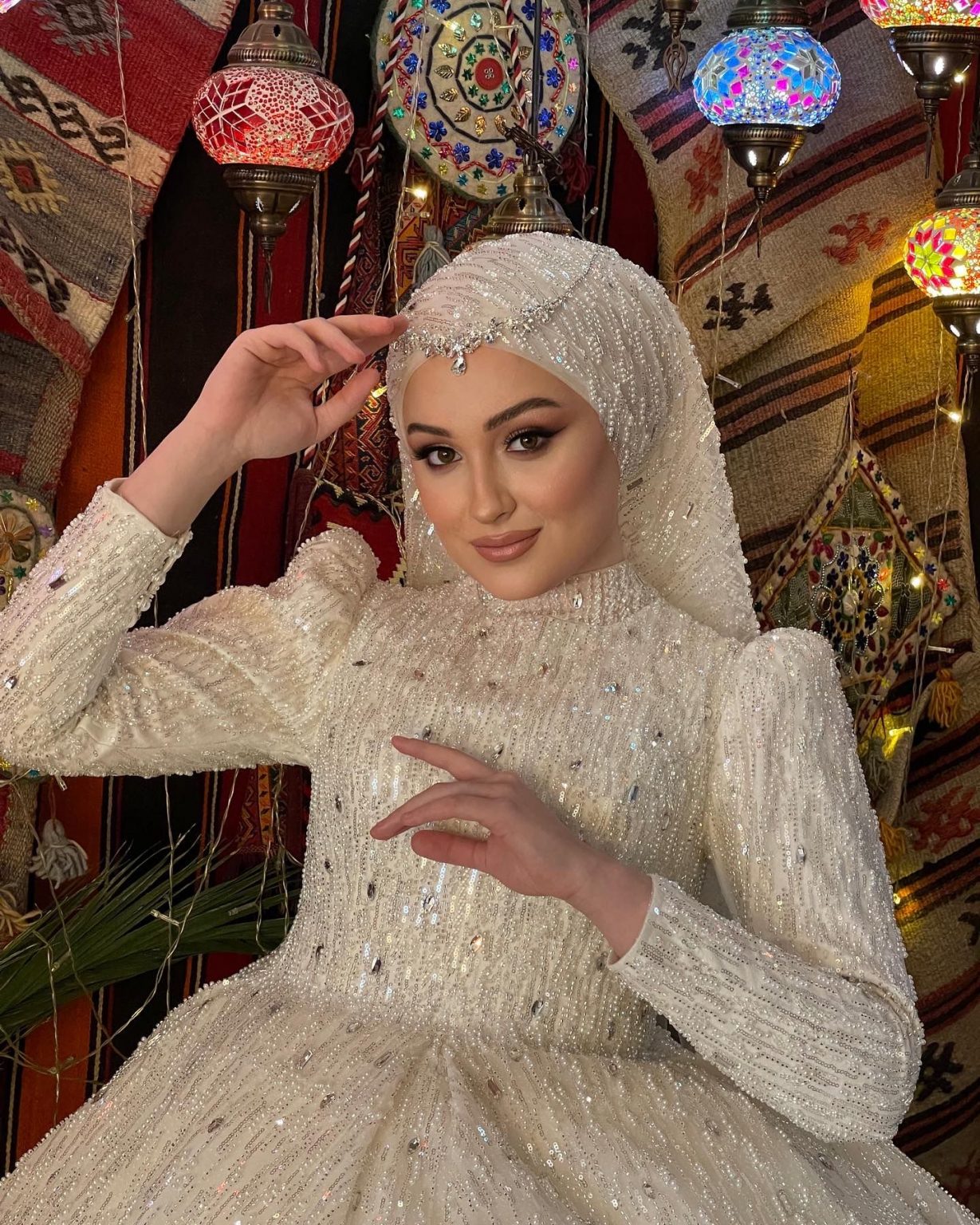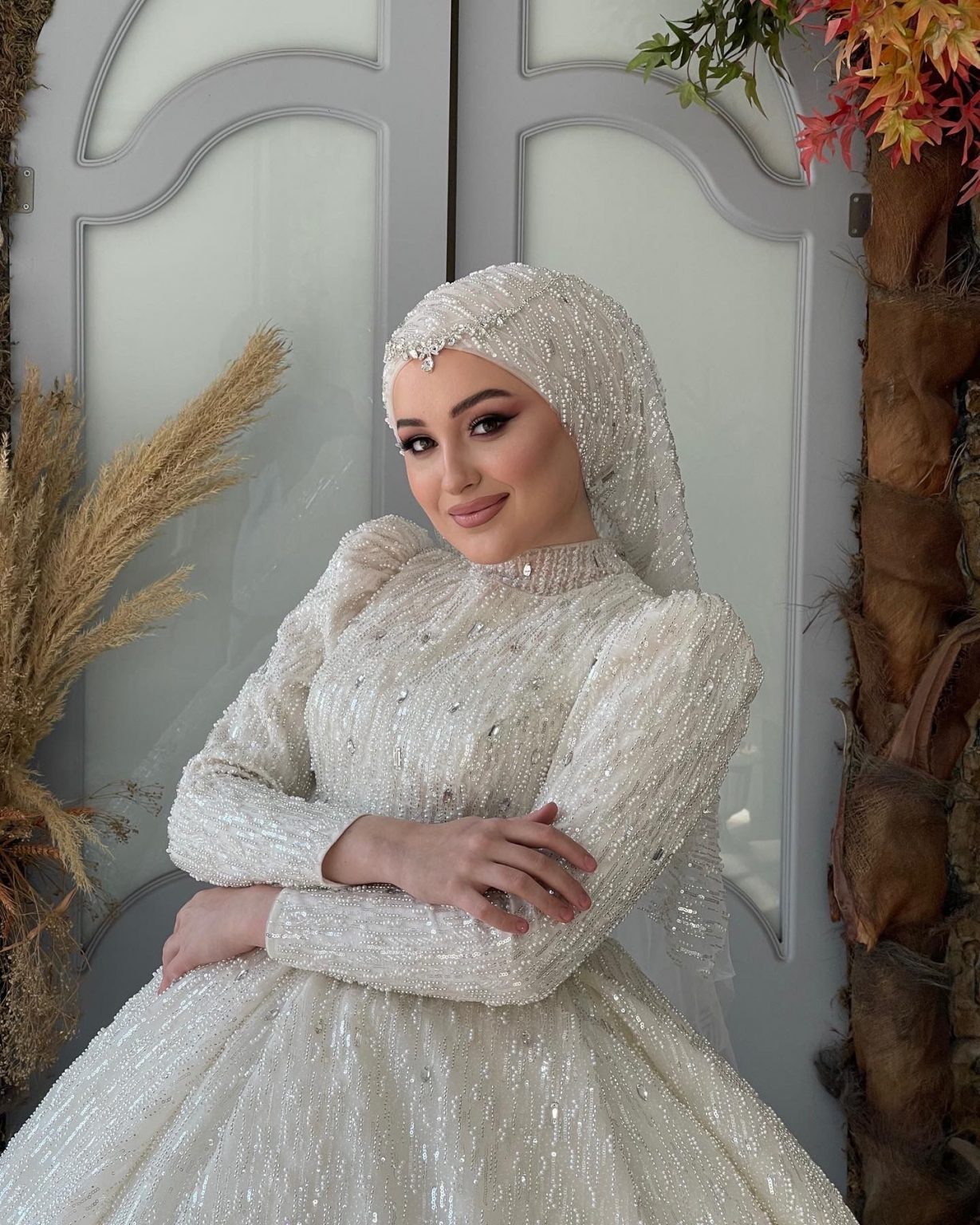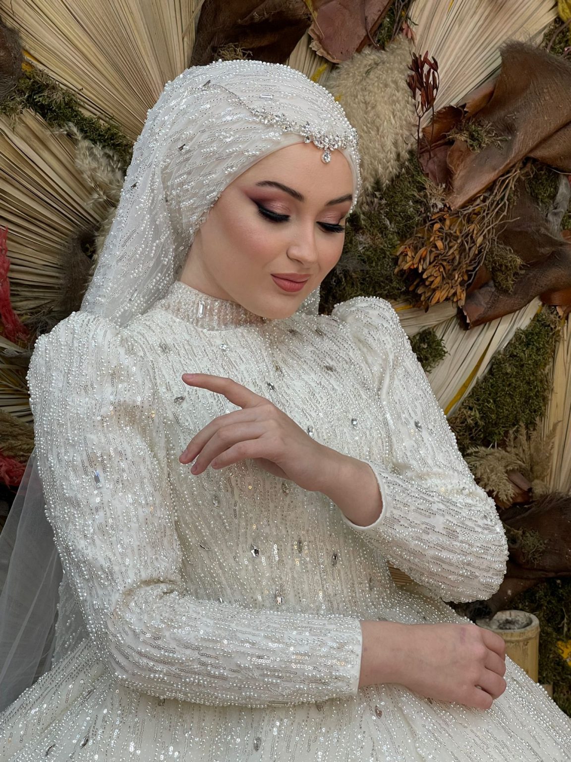 Hira Boncuk İşlemeli Tesettür Gelinlik