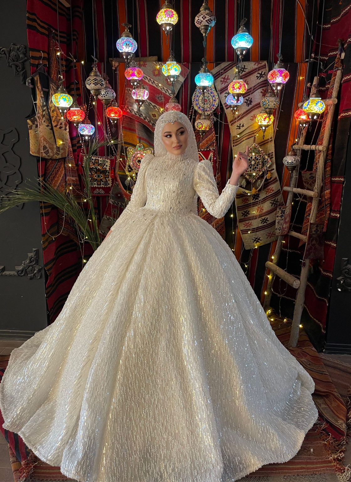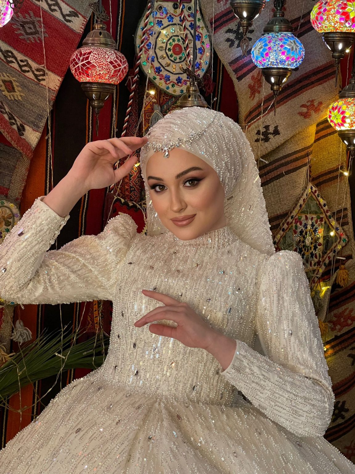 Hira Boncuk İşlemeli Tesettür Gelinlik, her detayı el emeğiyle işlenmiş zarafetin parlayan bir örneği. İnce boncuklar ve küçük taşlarla bezenmiş tül dokusu, hem geleneksel hem de modern bir atmosfer yaratır. Vücuda oturan zarif kesimi, prenses formundaki etekle birleşerek asil bir siluet oluşturur. Işığı büyüleyici şekilde yansıtan kumaşıyla sahnede adeta bir yıldız gibi parlar.